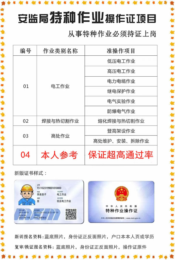 《市場監督管理局特種作業證》; 叉車司機-叉車證N1,電梯維修T,特種安全設備管理A,起重機指揮Q1,Q2起重司機(限門座式起重機),Q2起重司機(限橋式起重機),Q2起重司機(限門式起重機),Q2起重司機(限纜索式起重機),Q2起重司機(限塔式起重機)Q2起重司機(限流動式起重機),觀光和觀光列出司N2,壓力容器壓力管道管理A,電梯管理A,起重機械管理A,場(廠)內專用機動車輛管理A,工業鍋爐司爐G1,,鍋爐水處理G3,快開門式壓力容器操作R1,移動式壓力容器充裝R2,氣瓶充裝P,金屬焊接操作-壓力焊PE焊,非金屬焊接操作-壓力容器焊,(4年一審,需要到期前3個月進行)從事特殊工種作業人員必須熟悉相應特殊工種作業的安全知識及防范各種意外事故的技能。要求從業人員持卡上崗,即由國家安全生產監督管理局頒發《中華人民共和國特種作業操作證》方可上崗。