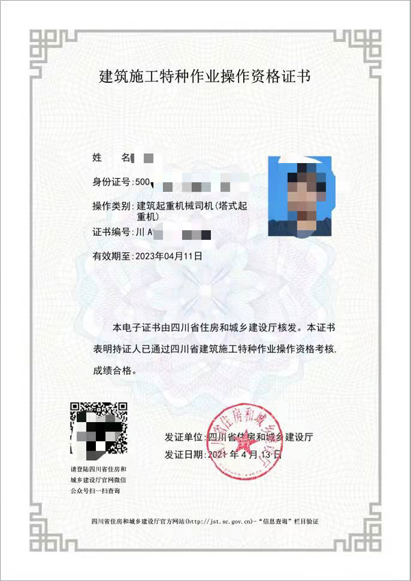 四川省住房和城鄉建設廳《特種作業操作證》: 建筑電工,建筑架子工,建筑架子工(附著升降腳手架,)建筑起重司索信號工,建筑起重司機(塔式起重機),建筑起重安裝拆卸工(塔式起重機)建筑起重機械司機(施工升降機),建筑起重安裝拆卸工(施工升降機),建筑起重機械司機(物料提升機),建筑起重安裝拆卸工(物料提升機),高空作業吊籃安裝拆卸工,經省級以上人民政府建設主管部門認定的其他特種作業。 國務院建設主管部門負責全國建筑施工特種作業人員的監督管理工作。 申請從事建筑施工特種作業的人員,應當具備下列基本條件: 1,年滿18周歲且符合相關工種規定的年齡要求,2, 初中及以上學歷,3, 符合相應特種作業需要的其他條件。 建筑施工特種作業人員是指在房屋建筑和市政工程施工活動中,從事可能對本人、他人及周圍設備設施的安全造成重大危害作業的人員。(兩年一復審到期前3個月復審); 建筑施工特種作業人員必須經建設主管部門考核合格,取得建筑施工特種作業人員操作資格證書(以下簡稱“資格證書”),方可上崗從事相應作業。